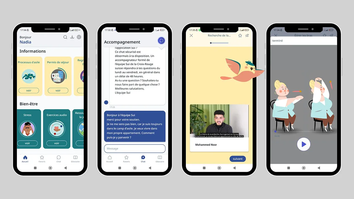 Disponible en plusieurs langues, l’App Sui SRK de la Croix-Rouge suisse (CRS) a été développée de manière interdisciplinaire et participative avec des personnes réfugiées. Elle vise à améliorer durablement leur bien-être en Suisse. L’application offre un accès numérique à bas seuil à des informations pertinentes pour le quotidien, à des programmes d’assistance locaux (approche Stepped Care), à des exercices pour favoriser l’autonomie sur le plan psychique et à un soutien psychosocial par des pair-e-s formé-e-s dans la langue maternelle.