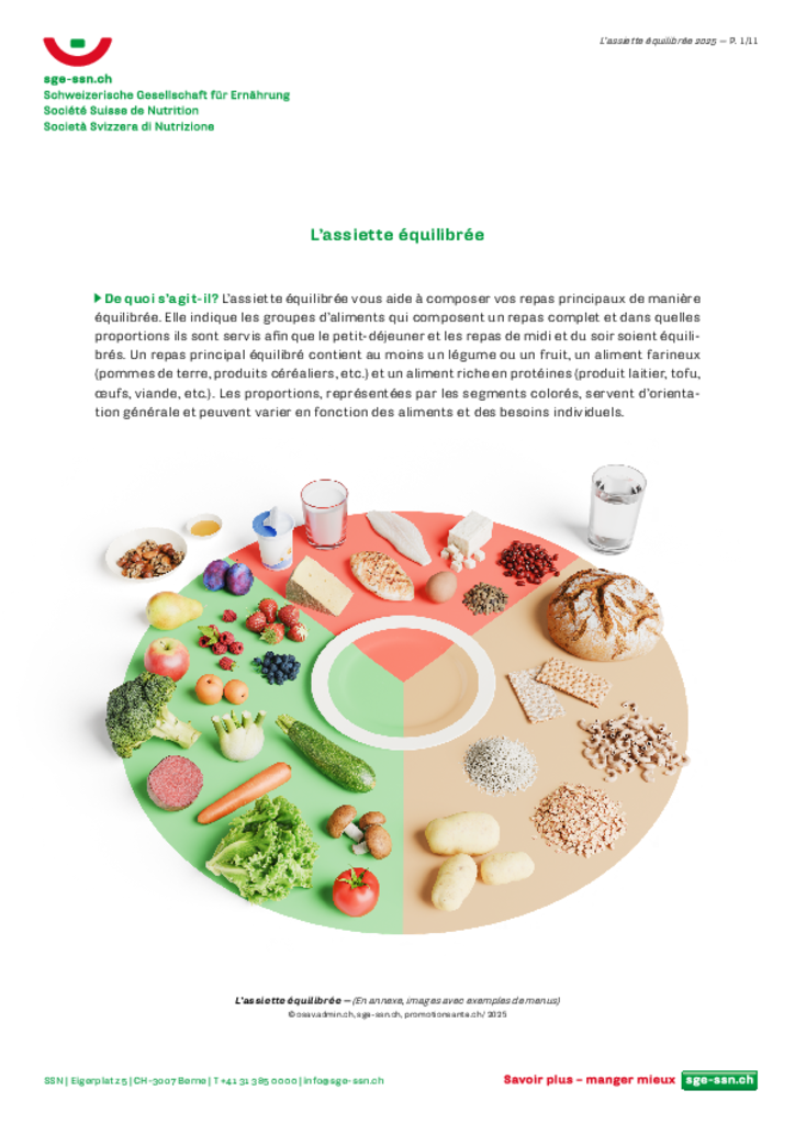 La nouvelle assiette équilibrée (version longue / version courte) montre de manière simple comment composer un repas principal sain et équilibré, quels que soient le mode de vie ou les habitudes alimentaires. Elle complète les recommandations nutritionnelles suisses 2024 et constitue un outil pratique pour les professionnel-le-s, les cantons et les programmes qui oeuvrent à la promotion d'une alimentation équilibrée. En savoir plus sur assiette-equilibree.ch.