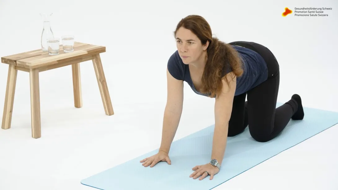 Après la prise de conscience vient le renforcement du plancher pelvien. Outre le plancher pelvien, les muscles abdominaux et dorsaux jouent également un rôle important. Dans la vidéo participative de Promotion Santé Suisse, des exercices simples à réaliser à la maison vous sont proposés. Vous pouvez les effectuer quotidiennement afin de renforcer la musculature autour de votre bassin. Votre bébé peut rester à vos côtés sur le tapis pendant les exercices.